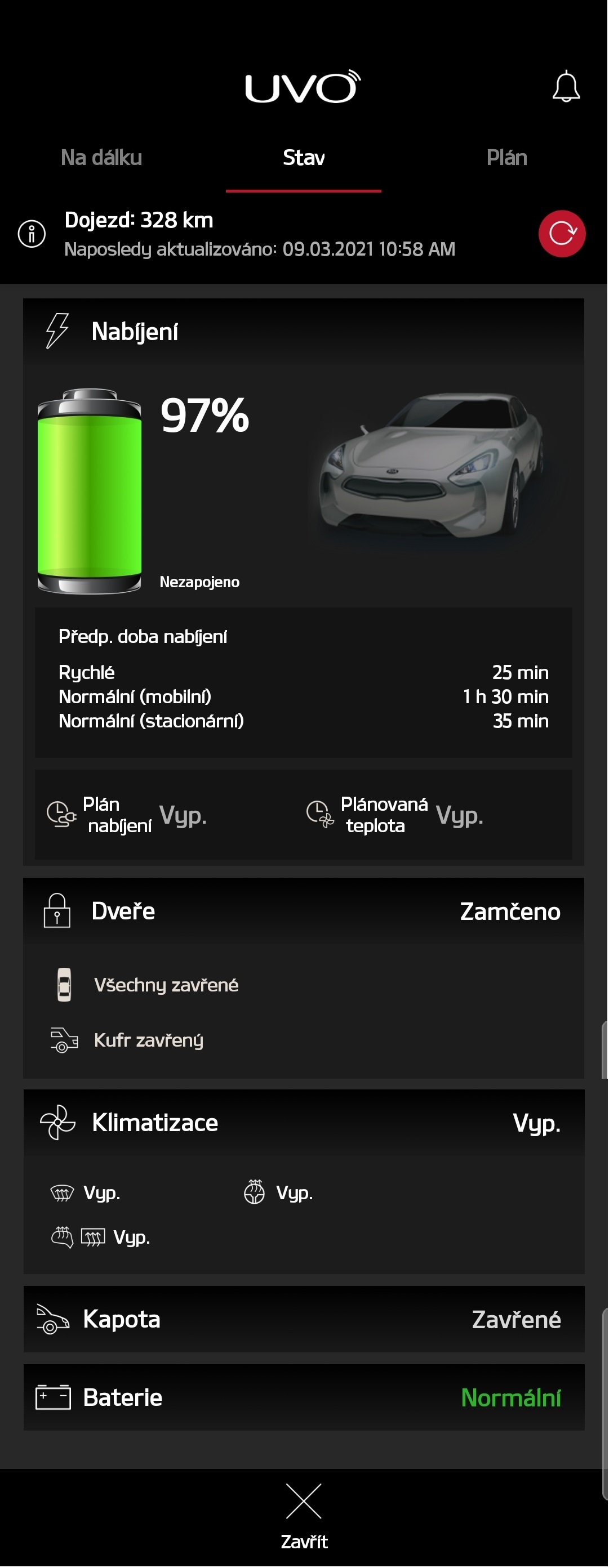 Automobilka KIA nabízí majitelům elektromobilů, ale i konvenčních vozů možnost propojení s mobilní aplikací UVO Connect. Stav nabití vysokokapacitního akumulátoru a aktuální stav 12V akumulátoru pak lze pohodlně kontrolovat z pohodlí domova přímo v aplikaci. UVO Connect je dobrou pomůckou nejen ke kontrole akumulátorů, umí toho mnohem víc. Majitel vozidla získává nepřetržitý přístup k poloze vozidla či může na dálku aktivovat řadu vlastností a funkcí, ať už se jedná o zamknutí či odemčení vozu, o spuštění klimatizace (zatím pouze u plných elektromobilů) nebo odeslání naplánované trasy do navigace.
