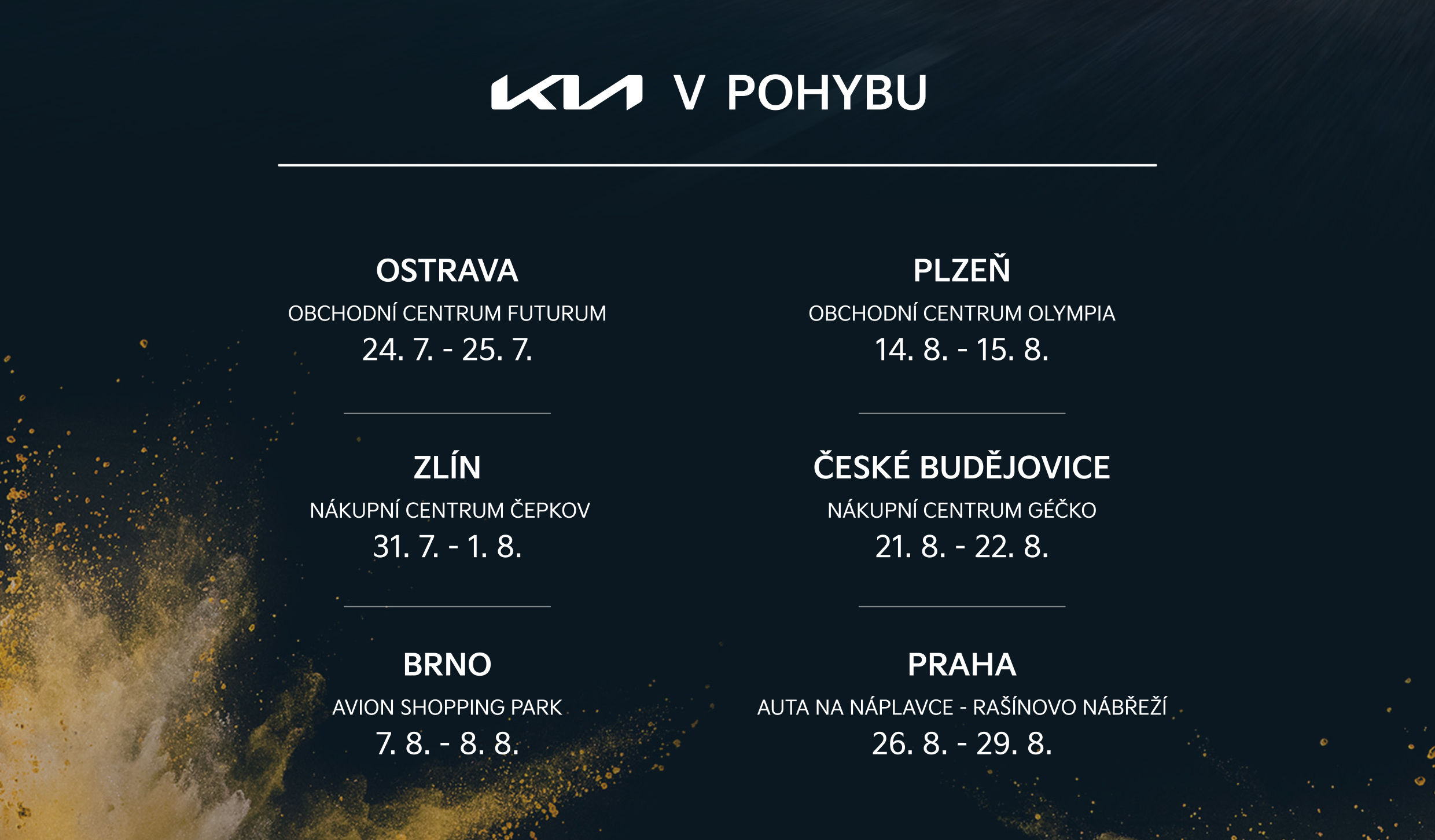 Společnost Kia Czech zahájí příští týden (24. 7. - 29. 8.) dynamické turné po jednotlivých městech České republiky, v rámci kterého představí novou identitu značky Kia a zároveň nabídne možnost otestovat celou řadu modelů. Turné ‚Kia v pohybu‘ zavítá do 6 měst včetně Prahy, kde bude probíhat v rámci tradiční open-air akce Auta na náplavce. Během šesti víkendů nabídne Kia v pohybu přibližně 600 zkušebních jízd v nejpopulárnějších modelech značky Kia, což z ní činí dosud nejintenzivnější kontaktní kampaň značky v České republice.