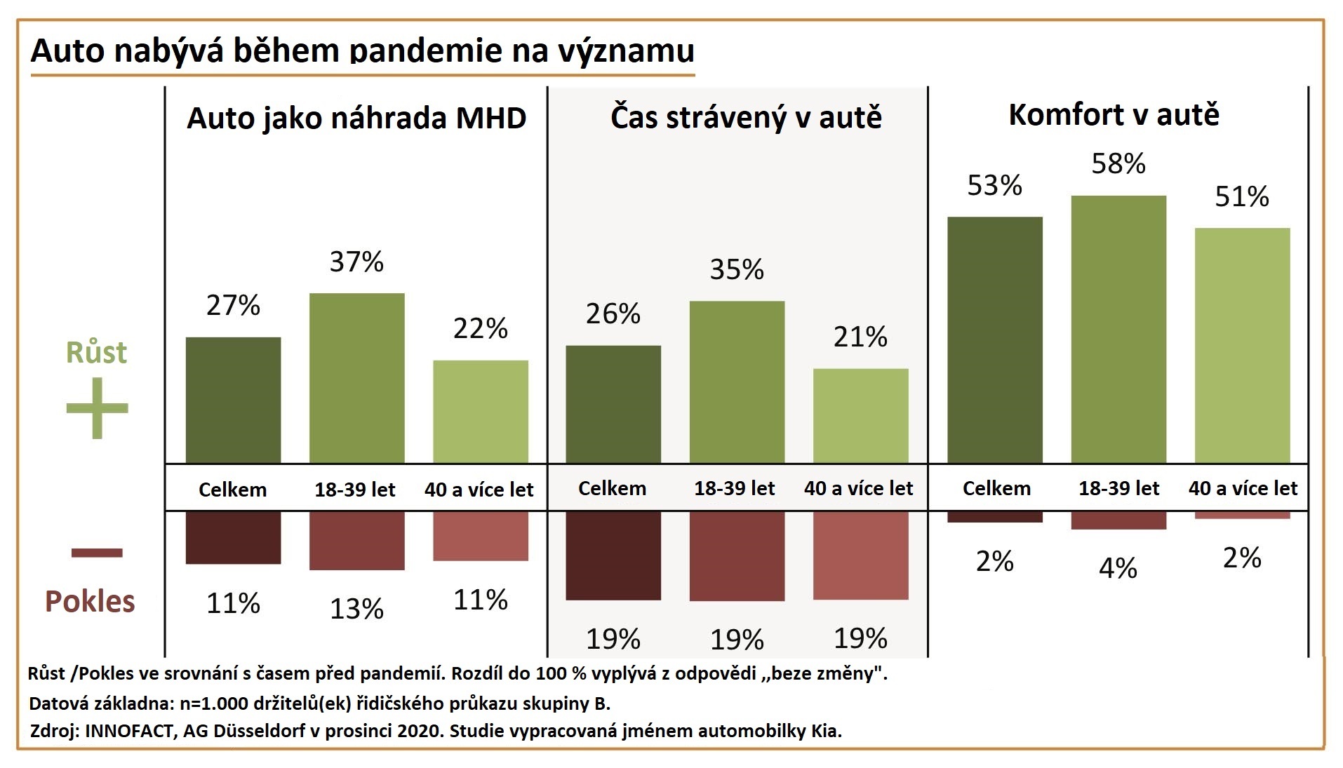 27 % dotázaných používá od začátku pandemie auto více, aby se vyhnulo jízdě ve veřejných dopravních prostředcích. U 18 - 39letých je to dokonce 37 %. Navíc se využívání automobilu změnilo, jak uvedlo 39 % účastníků studie. U mladších se to týkalo více než jedné poloviny (51 %). Uváděli, že auto používají více pro cesty, které dříve zdolávali prostřednictvím veřejných dopravních prostředků, např. pro jízdy na nákupy (kolem 26 %) nebo pro jízdy do práce (24 %). Změna chování v rámci mobility se projevuje také v nárůstu doby strávené v autě – i přes omezení veřejného života a narůstajícího objemu práce na home officu tráví 26 % dotázaných v autě více času než před začátkem pandemie. Mezi 18 -39letými se tento podíl pohybuje dokonce na 35 %. Pouze 19 % všech účastníků studie se ve vozidle zdržuje kratší dobu než dříve, u 55 % zůstala tato doba na stejné úrovni.