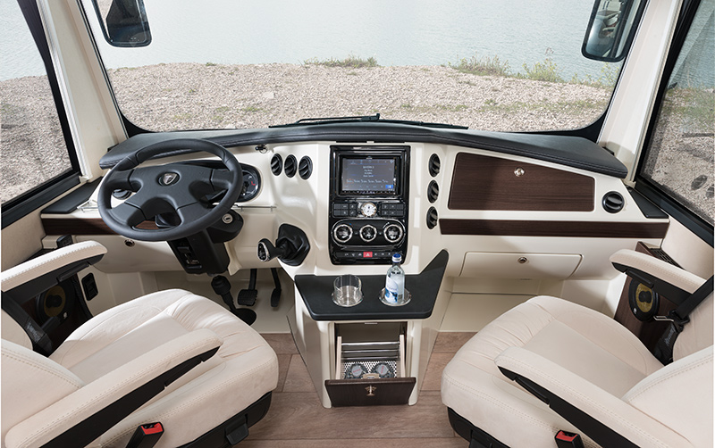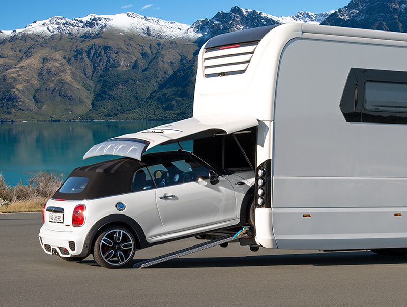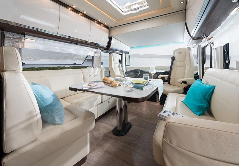 Samostatnou kapitolou je pak prostorný, designově a funkčně vymazlený interiér, kde se nezapře německá dokonalost. Dispozice vozu se liší podle modelů a velikostí, ale v žádném nechybí bohatě vybavený kuchyňský kout, ložnice s manželskou postelí a střešním panoramatickým oknem, prostorná koupelna i stůl s pohodlnými sedačkami. Samozřejmostí je také toaleta, podlahové vytápění, centrální vysavač, mobilní, ekologické a nezávislé zdroje energie SFC Energy, a další vychytávky, které znáte spíše z domova či luxusních hotelů. Lze si vybrat verze automobilů pro dvě osoby, ale i pro čtyři nebo až pět osob pro větší rodiny.