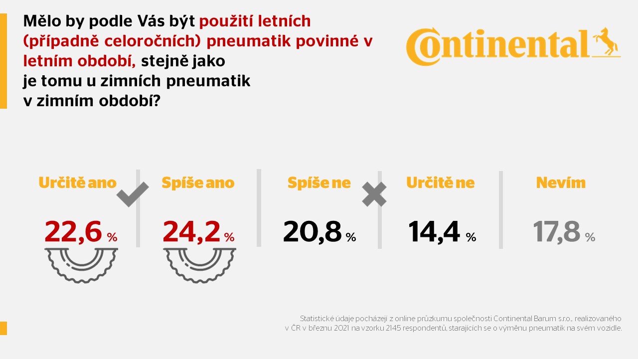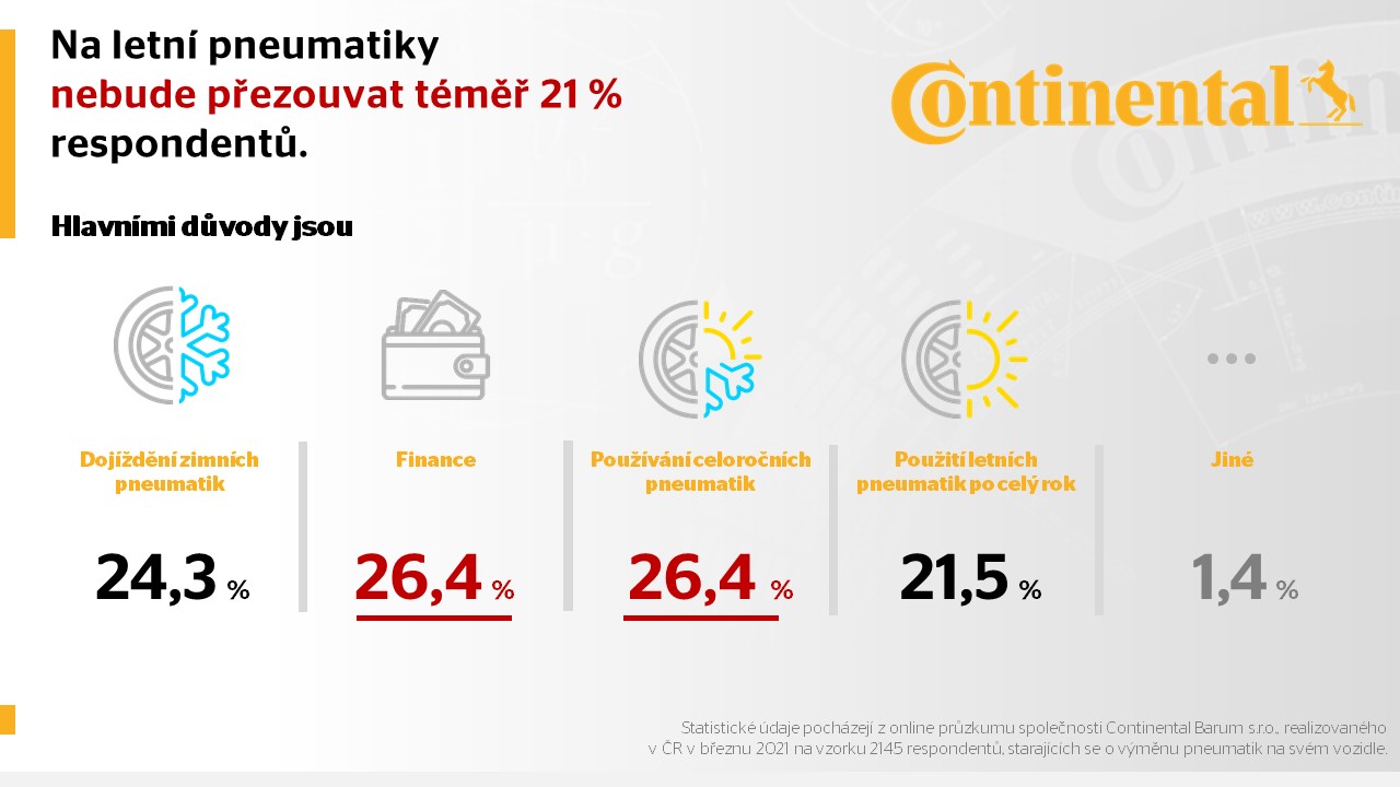 Podle očekávání rovněž měla na řidiče dopad koronavirová epidemie – přesto více než čtvrtina z nich najela kvůli pandemii více kilometrů než před rokem. Vyplývá to z nového průzkumu společnosti Continental Barum pro nadcházející sezonu, podle kterého v Česku přezuje na letní pneumatiky 80 % majitelů osobních automobilů. Použití letních pneumatik není v České republice povinné a obecně se na letní pneumatiky doporučuje přezout ve chvíli, kdy se teploty dlouhodobě drží nad 7° C. Podle aktuálního průzkumu společnosti Continental by takřka polovina českých motoristů dokonce podpořila názor, aby používání letních (nebo celoročních) pneumatik bylo přikázáno zákonem, podobně jako to platí u zimního obutí. Proti takové zákonné úpravě by se ale postavilo 35 % respondentů. Ze stejného šetření také vyplývá, že do konce dubna chce mít přezuto na letní pneumatiky více než 62 % českých řidičů, přičemž 8 % dalších se k tomuto kroku chystá do konce května. Na letní pneumatiky poté z různých důvodů nepřezouvá 20 % motoristů. Mezi nejčastější příčiny patří používání celoročního obutí, snaha tzv. „dojet“ opotřebované zimní pneumatiky a finance, což může souviset se současnou pandemií koronaviru.