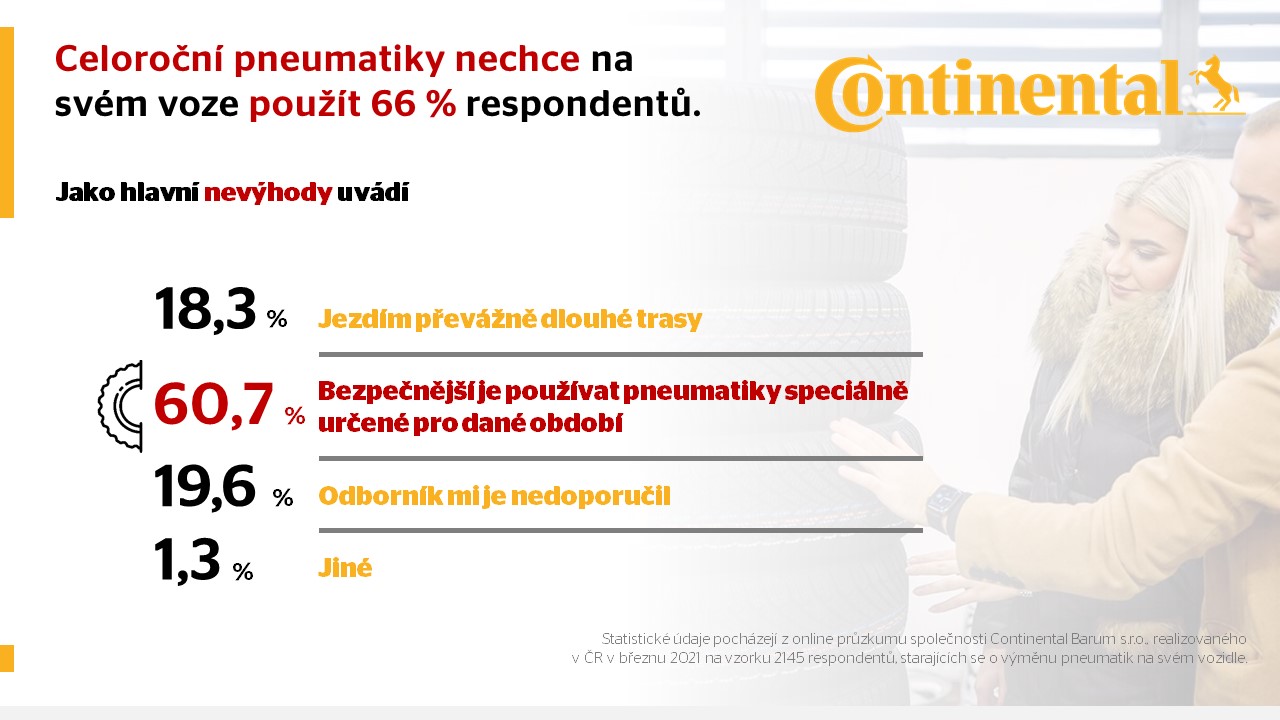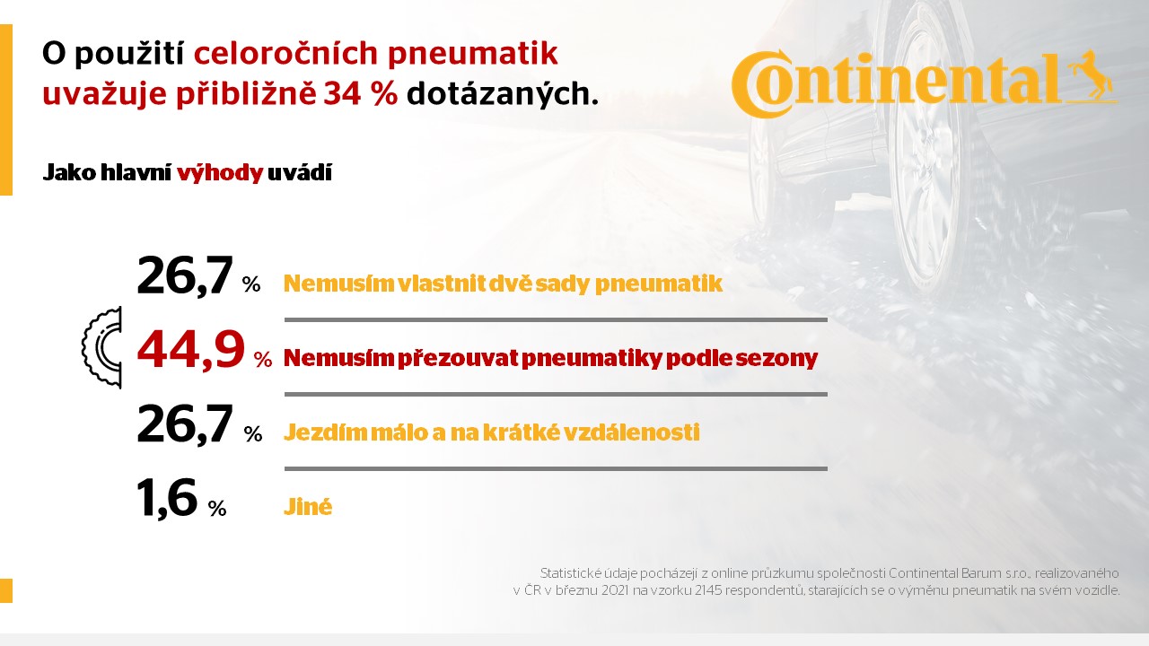 „Celoroční pneumatiky se vyplatí především řidičům, kteří během roku najezdí méně kilometrů na kratší vzdálenosti. V posledních letech vidíme, že obliba celoročních plášťů u českých řidičů pomalu roste. Jedním z důvodů je i neustálý vývoj technologií, které vylepšují jízdní vlastnosti a bezpečnost těchto pneumatik. Nesporná výhoda je i finanční a časová úspora – řidiči však nesmějí zapomínat na fakt, že jde o kompromisní řešení, které s sebou nese jistá omezení. Při jejich výběru doporučujeme řídit se testy nezávislých odborníků,“ upozorňuje Magda Nagy, ředitelka divize marketing Continental Barum. Statistické údaje pocházejí z online průzkumu společnosti Continental Barum s.r.o., realizovaného v ČR v březnu 2021 na vzorku 2145 respondentů, starajících se o výměnu pneumatik na svém vozidle.