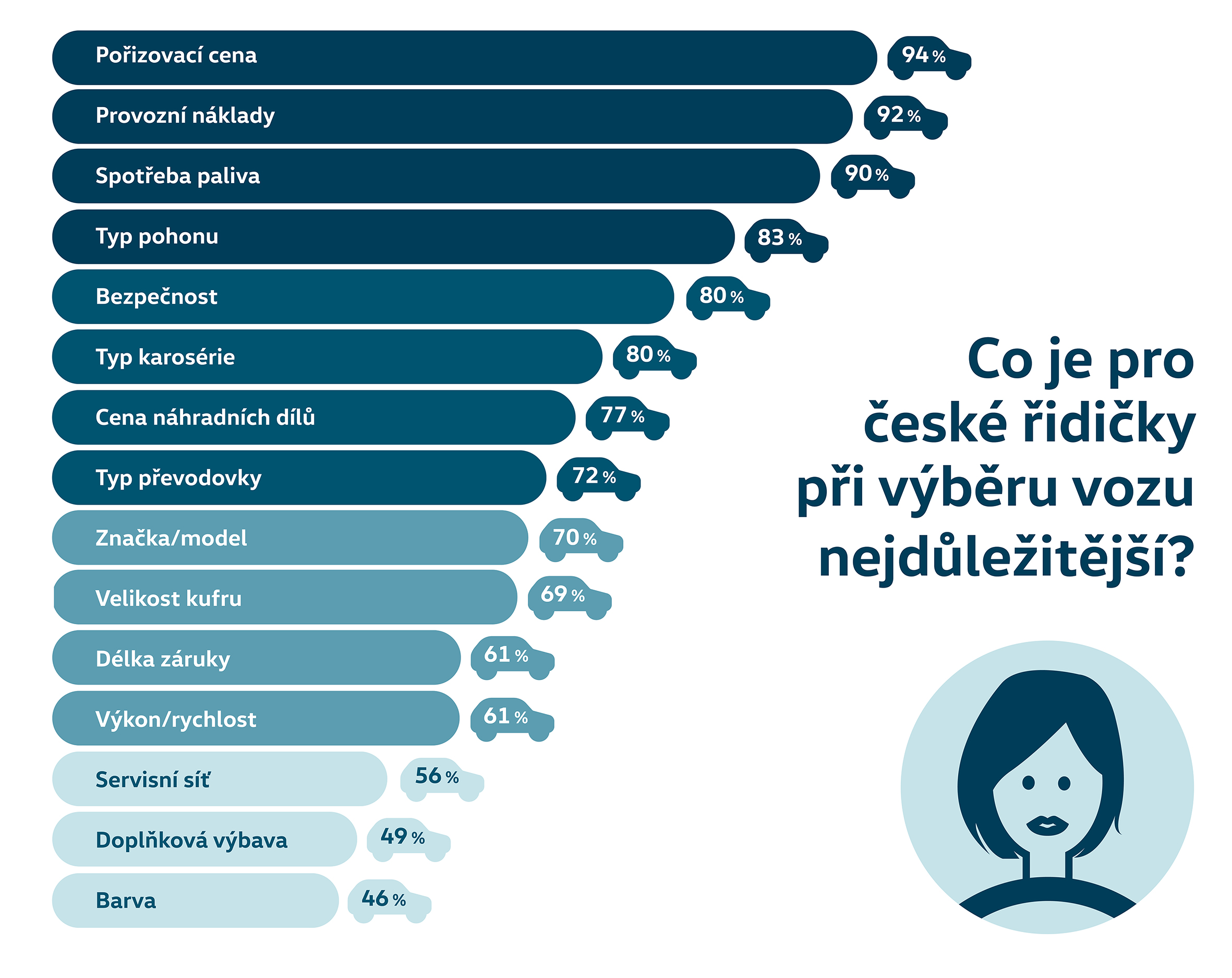 České řidičky s pořízením automobilu rozhodně neotálejí. Čtvrtina si svůj první vůz pořídila už před dvacátými narozeninami, ve třiceti letech vlastním autem jezdilo téměř 90 % z nich. Nejvíce na vlastní vůz spěchají v Karlovarském kraji, načas si naopak dávají v Plzeňském kraji a Praze. Pro celých 77 % řidiček je auto zcela nepostradatelnou součástí jejich každodenního života. Představuje pro ně především pohodlnou možnost, jak s blízkými cestovat za koníčky, vzděláním i zážitky, každé třetí ženě pak vlastní auto dává pocit svobody. Pořízení vozu je však někdy otázkou potřeby, například kvůli absenci veřejné hromadné dopravy, což potvrzuje i 7 % respondentek, které auto označily za nutné zlo.