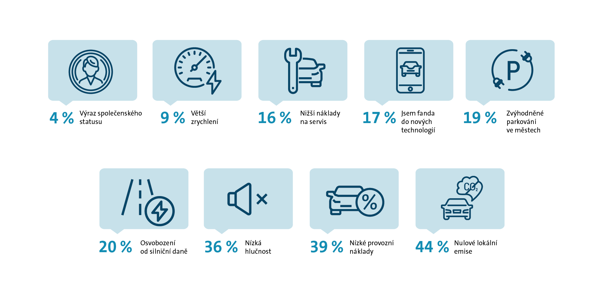 Čeští řidiči jsou zatím ve vztahu k elektromobilům obezřetní, ale do budoucna jejich nákup plánuje poměrně velká část z nich. Zatímco během nadcházejících dvou let o pořízení elektromobilu uvažuje nebo je o něm pevně rozhodnuto 19 % řidičů, v horizontu pěti let už jejich podíl vzrostl na 26 %. Zajímavým zjištěním je, že nejčastěji o elektromobilu uvažují řidiči na Vysočině (36 %) a v Olomouckém kraji (34 %), nejméně atraktivní je pak pro motoristy z Pardubického kraje (7 %). Důvodů pro pořízení elektromobilu je podle dotazovaných řidičů hned několik. Mezi nejčastěji zmiňovanými přednostmi najdeme nulové lokální emise, které hrají v rozhodování roli pro 44 % řidičů. Klíčovou vlastností jsou také nízké provozní náklady, které jsou důležité pro více než třetinu z nich. Naopak svižnější akcelerace nebo prestiž spojená s elektromobilitou jsou rozhodujícím faktorem pro každého dvacátého řidiče.