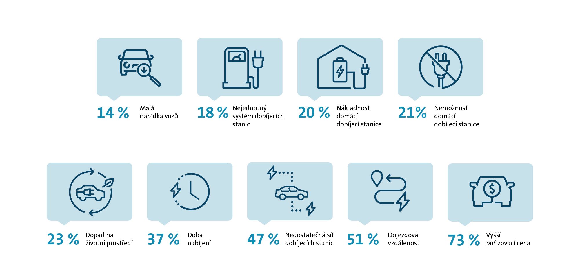 I když 58 % řidičů věří, že elektromobily jsou budoucností, optimismus je opouští tehdy, kdy mají zhodnotit rozvoj sítě dobíjecích stanic. Podle poloviny účastníků průzkumu totiž bude trvat ještě minimálně 10 let, než bude hustota dobíjecích stanic dostatečná. Třetina (34 %) řidičů je pak toho názoru, že na její rozvoj bude stačit šest až deset let. Pouze jeden ze sta dotázaných řidičů počítá s adekvátní dobíjecí sítí v horizontu jednoho až dvou let. Při pořízení elektromobilu by čeští řidiči nejraději nepřekračovali šesticiferné sumy. 37 % z nich by se chtělo vejít do půl milionu korun, pro každého šestého by pak maximální limit představovala částka 750 000 Kč. Právě vyšší pořizovací cena patří společně s limitovanou dojezdovou vzdáleností a hustotou dobíjecích stanic k nejčastěji zmiňovaným obavám. Zatímco pětinová dotace poskytovaná státem by k pořízení elektromobilu přesvědčila pouze 7 % oslovených řidičů, třicetiprocentní dotace by už motivovala každého čtvrtého. Státní příspěvek v hodnotě poloviny pořizovací ceny vozu by pak byl dostatečným argumentem pro 58 % řidičů.